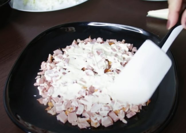- Основа салата – копченое мясо, но для первого слоя используем пока половину, сверху слегка промазываем майонезом.