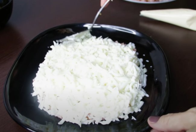 - Весь салат посыпаем тертым сыром, равномерно его распределяем, промазываем майонезом.