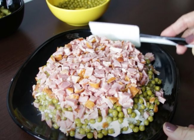 - Следующий слой – белки плюс майонез, поверх рассыпаем зеленый горошек. Его не смазываем майонезом, он и так достаточно сочный.