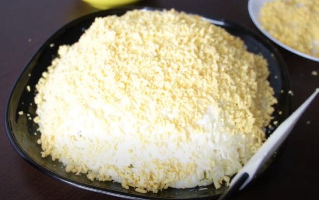 - Завершающий слой делаем из желтков, которые также измельчаем на мелкой терке.