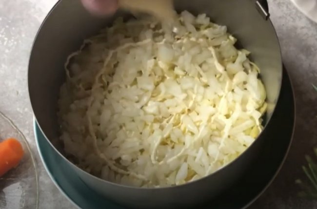 - Берем терку и, установив на блюдо кольцо, натираем отварной картофель, разравниваем и покрываем майонезом. Затем слой лука, копчености и снова майонез.
