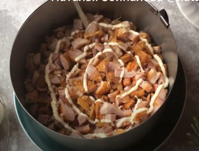 - Для сборки салата используем квадратную или круглую форму, первый слой делаем из копченого мяса. Смазываем его заправкой и посыпаем орешками.