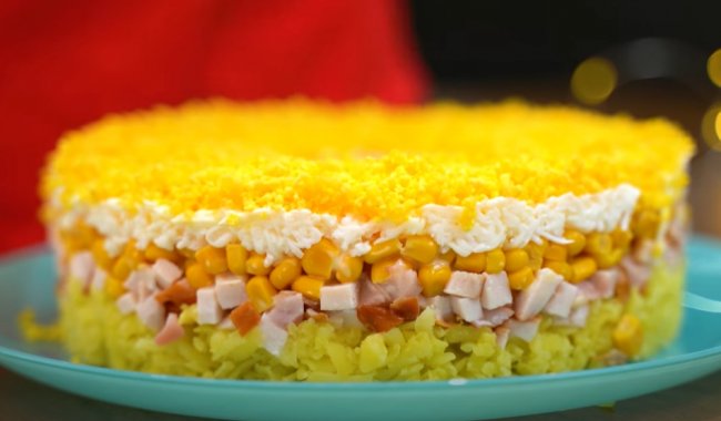 - Мясной слой присыпаем сладкой кукурузой и снова покрываем майонезом.