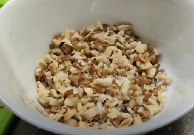 - Берем грецкие орехи – самые красивые орешки откладываем в сторону, они понадобятся для украшения, остальные измельчаем обычным ножом.