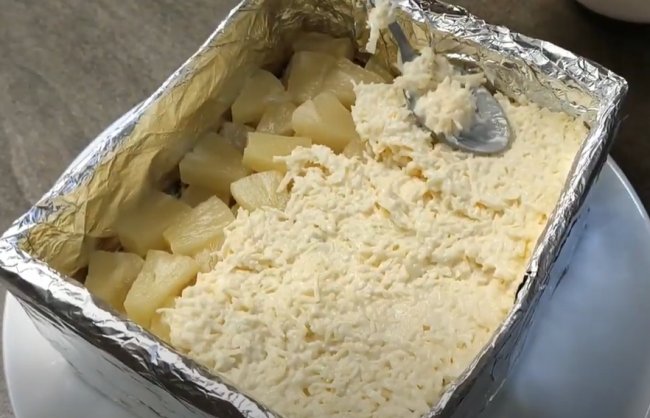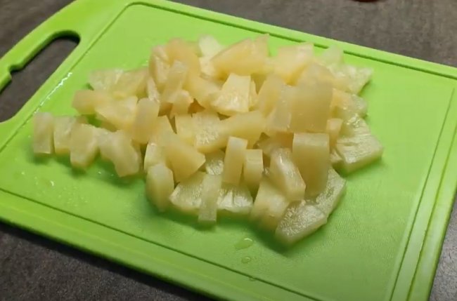 - Используйте консервированный ананас. Его нужно просушить от лишнего сиропа и нарезать кусочками.