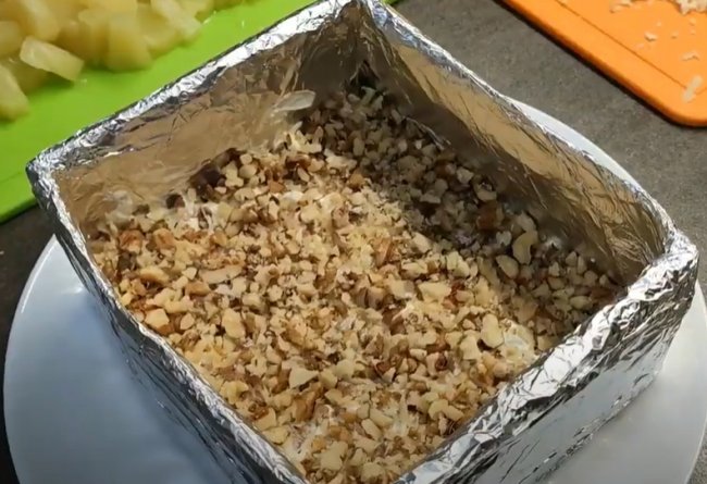 - Немного кусочков ананаса оставляем для украшения, остальные фрукты раскладываем поверх орешков.