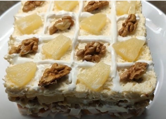 - Майонезом или сметаной рисуем поверх салата сеточку, в шахматном порядке украшаем блюдо орехами и кусочками ананасов.