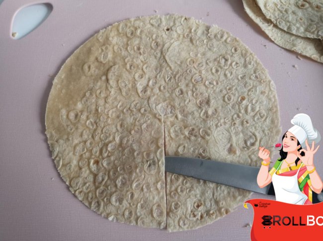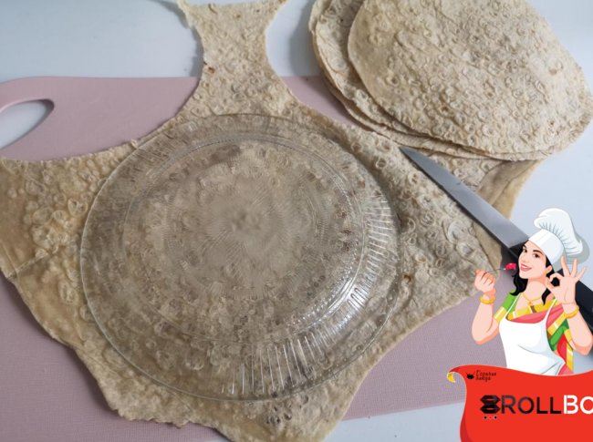 Вырезаем в лаваше при помощи тарелки круг... делаем один надрез из середины круга.
