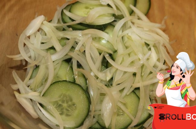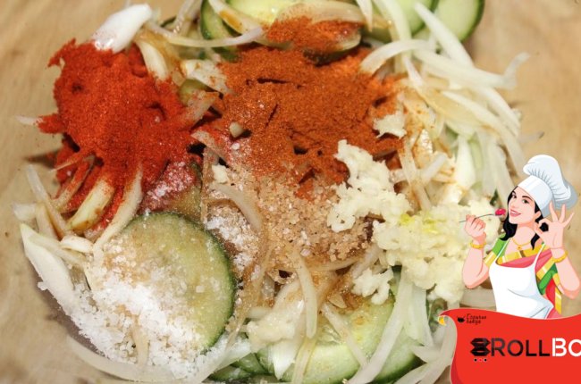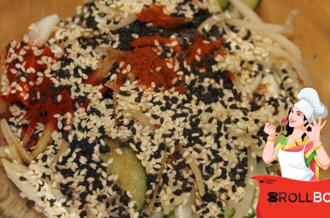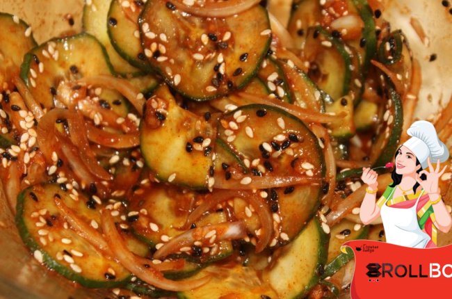 Ингредиенты Свежий длинный огурец - 1 шт. Лук репчатый - 1/2 шт. Соль - по вкусу Соевый соус - 1 ст.л. Сахар коричневый (можно заменить белым) - 1 ч.л. Молотый перец чили - 1/2 ч.л. (по вкусу) Паприка сладкая молотая - 1 ч.л. Чеснок - 1 зубчик Семена кунжута - 2 ст.л. Этот салат обязательно
