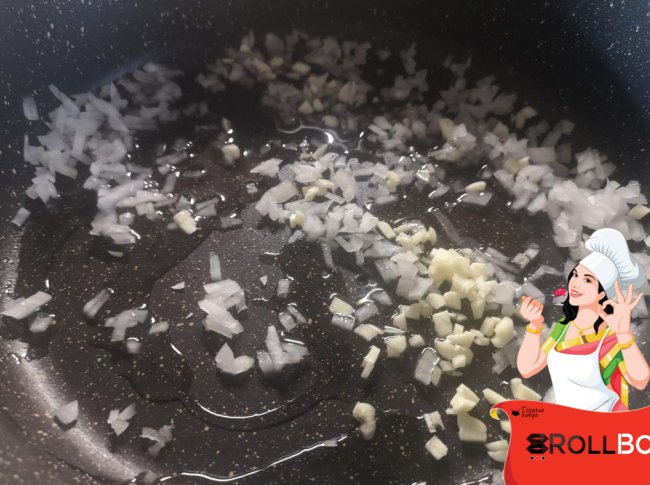 Сначала очень мелко нарезаем репчатый лук и чеснок. Кладем на холодную сковороду с растительным маслом. Включаем средний огонь, обжариваем до прозрачности лука.