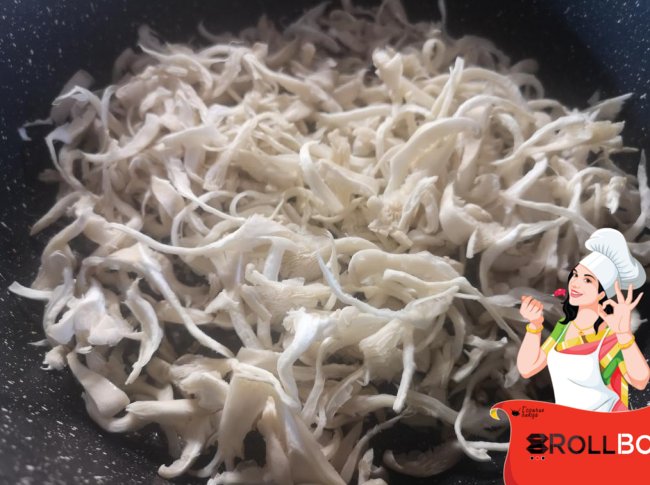 Вешенки руками разделяем на волокна и добавляем к луку... обжариваем минуты две.