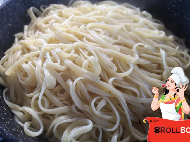 В подсоленной воде варим пасту по инструкции на упаковке. Откидываем на сито и добавляем потом в соус.