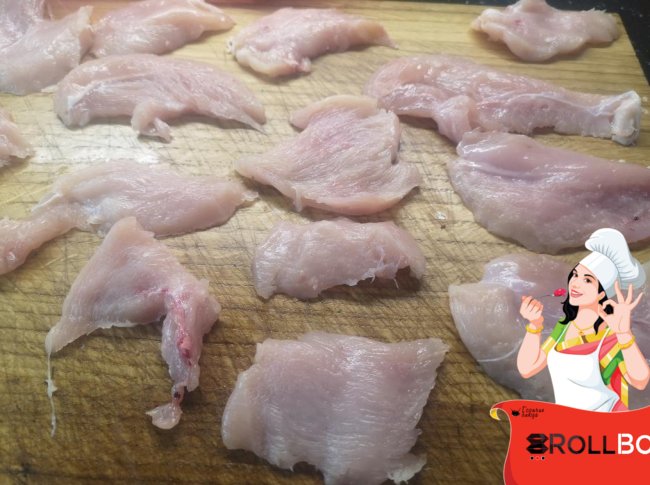 Теперь нарежем куриное филе кусочкам шириной где-то 7 мм...
