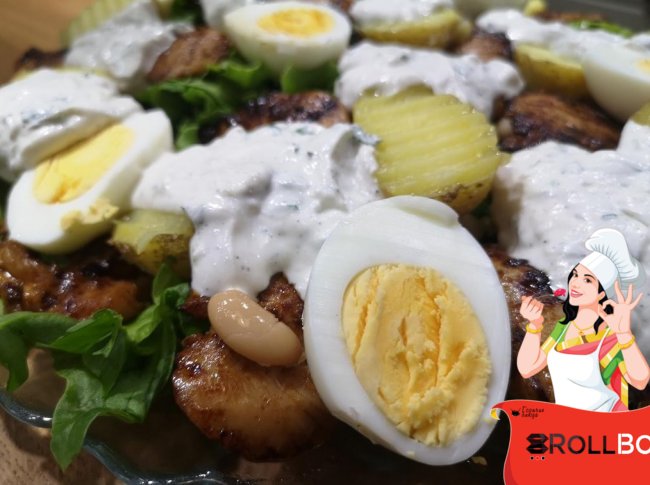 Ингредиенты куриное филе - 400 гр. соевый соус - 40 гр. растительное масло - 2 ст.ложки соус кимчи - 40 гр. чеснок - 1 зубчик микс салатов картофель ~ 5 шт. яйца - 3 шт. фасоль в с/с - 200 гр. (полбанки) Соус: сметана - 250 гр. зелень кинзы чеснок - 3 зубчика кунжутное масло - 1 ч.ложка соль,