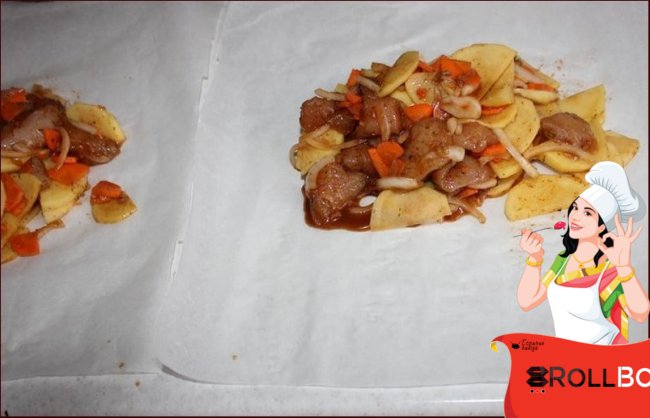 Ужины в пергаменте на сковороде Приготовление Попался мне на глаза в интернете ролик с ужином в пергаменте и я решила попробовать приготовить. Ингредиенты: Куриная грудка – 400 г (можно заменить любым мясом) Лук – 100 г Морковь – 100 г Картофель – 500 г Растительное масло – 30 г Соевый соус – 30 г
