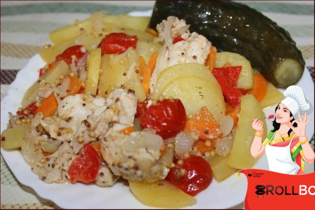 На следующий день решила сделать по-другому. Продукты брала на глазок- картошка ,куриное филе ,сладкий перец, помидоры черри, лук, чеснок ,горчица французская и обычная, соль, перец, приправа для картофеля, приправа для курицы, растительное масло.