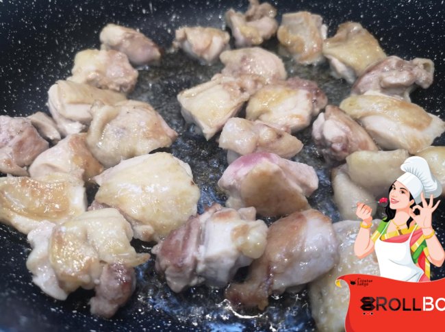 Обжарила филе бедра, нарезанное средними кусочками, до золотистой корочки. Убрала со сковороды.