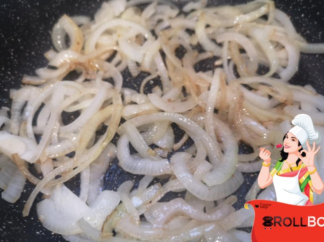 На этой же сковороде обжарила до золотистого цвета репчатый лук, нарезанный полукольцами.