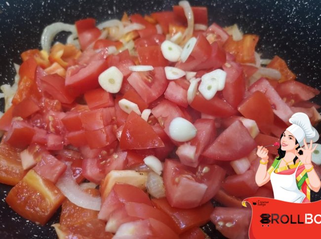Перец стал мягким, добавила нарезанные кубиком помидоры и чеснок, нарезанный слайсами. Потушила все минуты три.