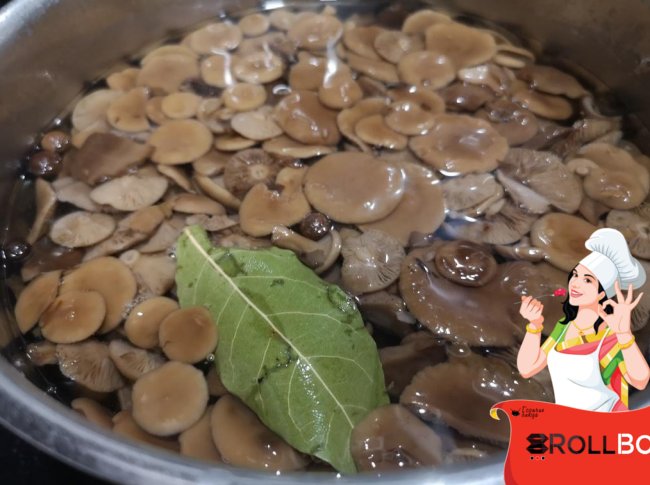 Варим маринад. Как только закипит, выкладываем грибы в маринад. Кипятим 15 минут.