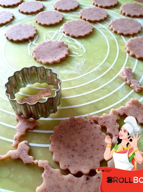Раскатайте тесто на рабочей поверхности до толщины 3 мм на посыпанной мукой рабочей поверхности и вырежьте печенье формочкой диаметром около 5 см.