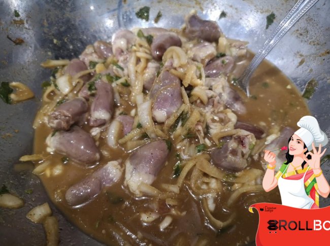 Сердечки солим по вкусу, добавляем приправы. Кладем нарезанный репчатый лук и зелень кинзы.