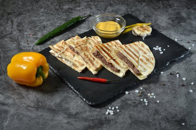 Раскрываем лепешку и намазываем говяжий фарш, закрываем лепешку.