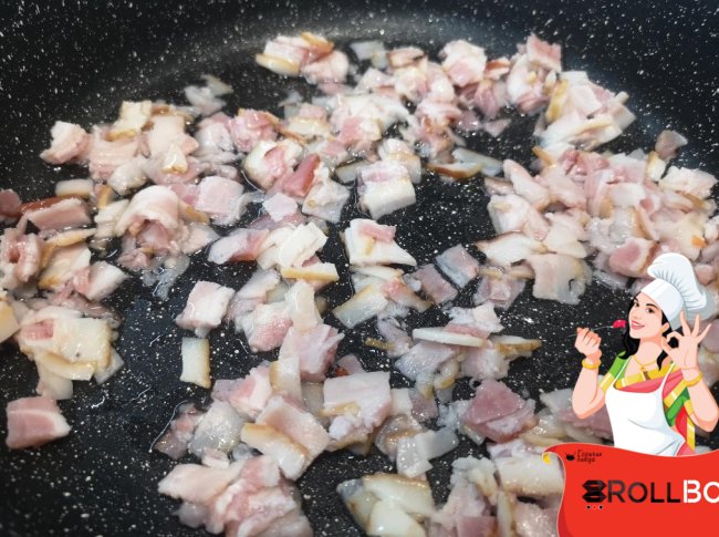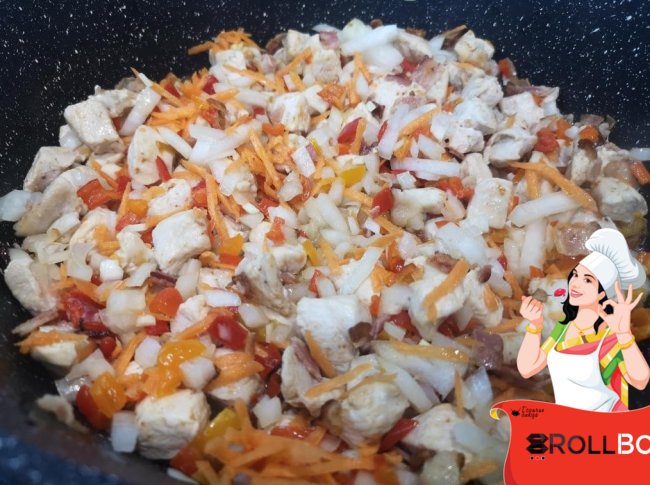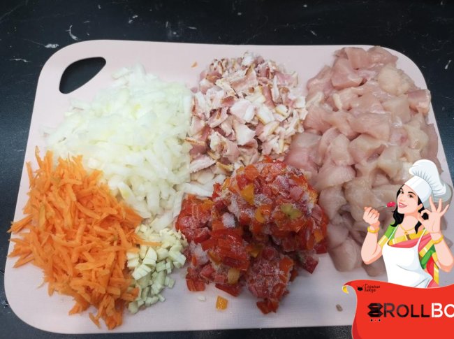 2. Лук нарезать мелким кубиком, морковь натереть на терке, перец нарезать соломкой, а чеснок измельчить. Филе и бекон нарезать небольшими кусочками.
