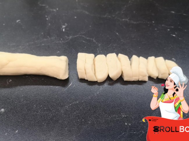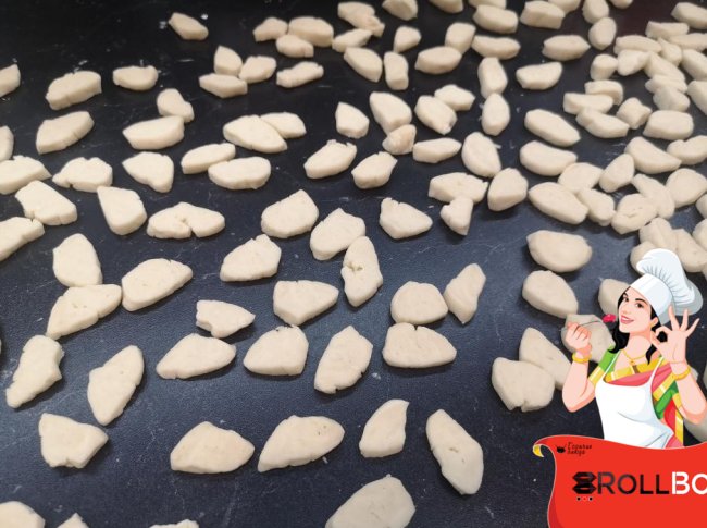 4. Тесто скатать в жгутики, нарезать на маленькие кусочки (галушки при варке увеличатся в размере раза в 2 точно!).