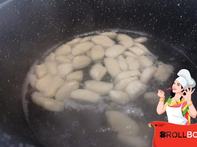 Варить галушки партиями в кипящей воде после всплытия минуты 3-5 (зависит от размера).