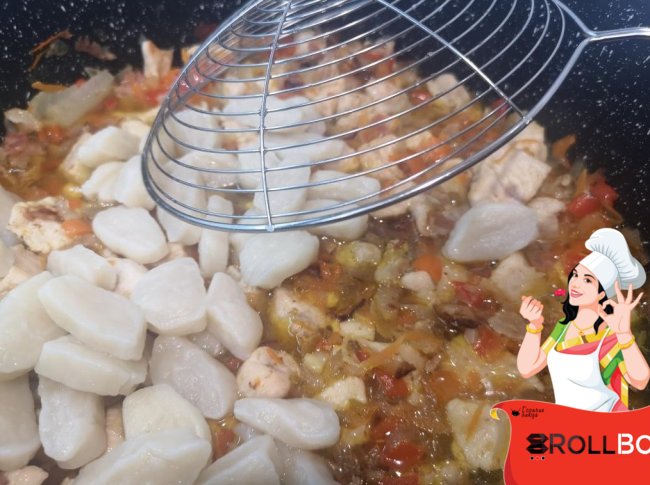 5. Выловить галушки шумовкой и добавить в сковороду к курице с овощами.
