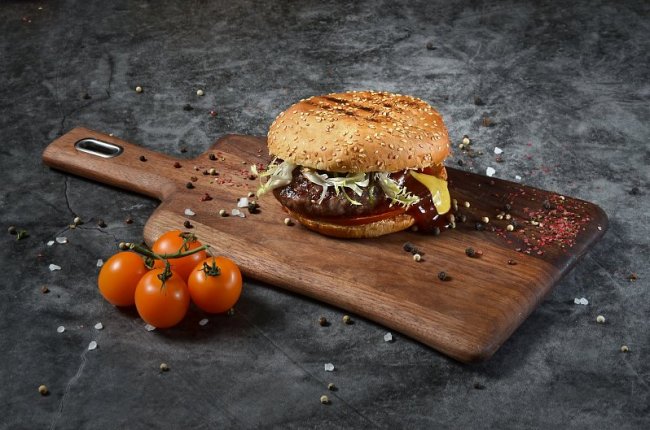 Выкладываем гамбургер на гриль и обжариваем 1 минуту при температуре 180 °С.