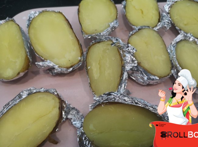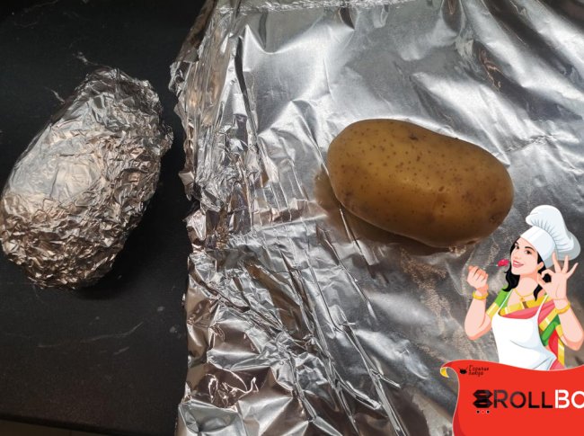 Затем достала, дала немного остыть. Чтобы все происходило побыстрее, разрезала клубни пополам прямо в фольге.