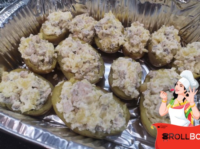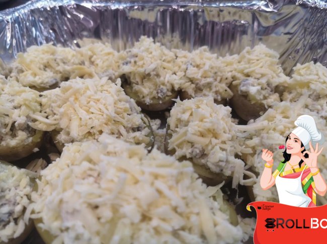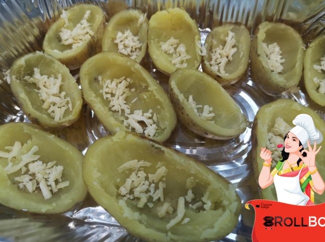 Ложкой выскоблила мякоть картофеля. Должна остаться своеобразная лодочка с бортиками. Уложила эти "лодочки" в форму. Присыпала каждую тертым картофелем.