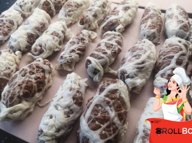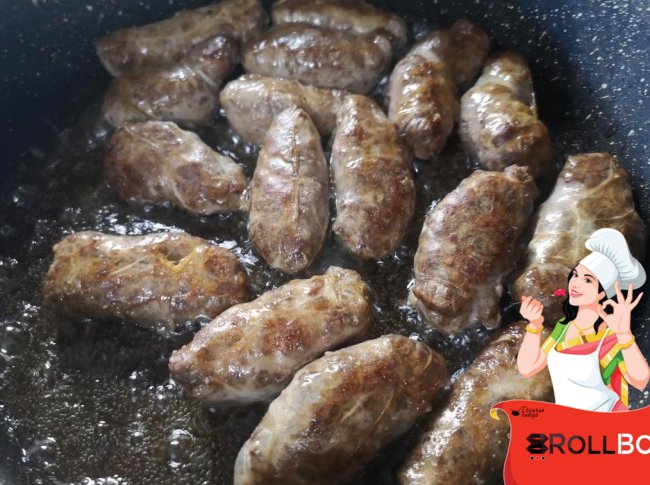 Затем раскладывала жировую сетку, с одной стороны клала по ложке начинки и закручивала все, как блинчик.