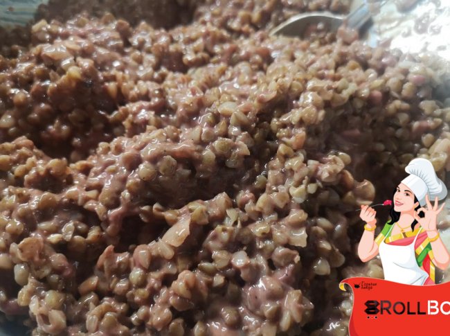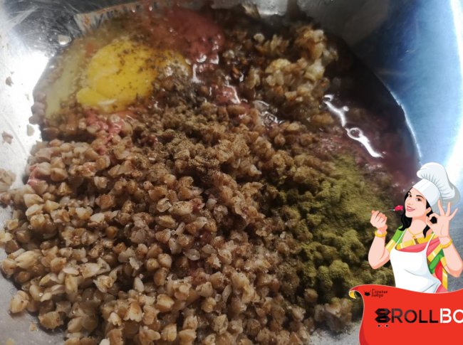 Смешала гречку, печень, репчатый лук, яйцо. Добавила соль, молотый черный перец и хмели-сунели.