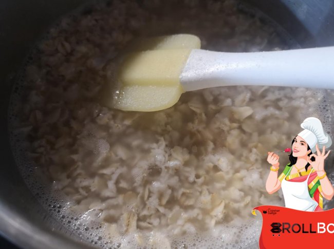 Сначала залила овсяные хлопья двумя стаканами кипятка... Посолила и добавила еще щепотку сахарного песка (в рецепте этого не было). Варила до готовности где-то 15 минут.