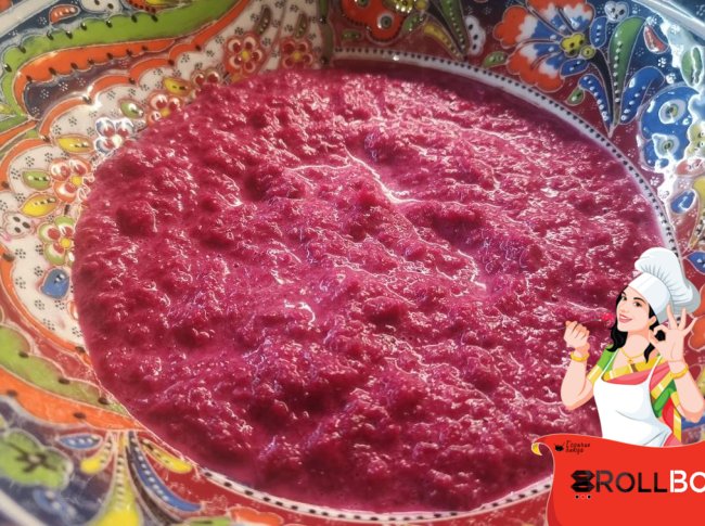Ингредиенты Бисквит: отварная свекла - 250 гр. яйца - 3 шт. растительное масло - 1 ст.ложка крахмал или мука - 80 гр. соль - 1 ч.ложка без верха сахарный песок - 0,5 ч.ложки Начинка: творожный сыр - 300 гр. укроп (если сам сыр без зелени) маринованные огурцы -2 шт. (или 1 соленый огурец по