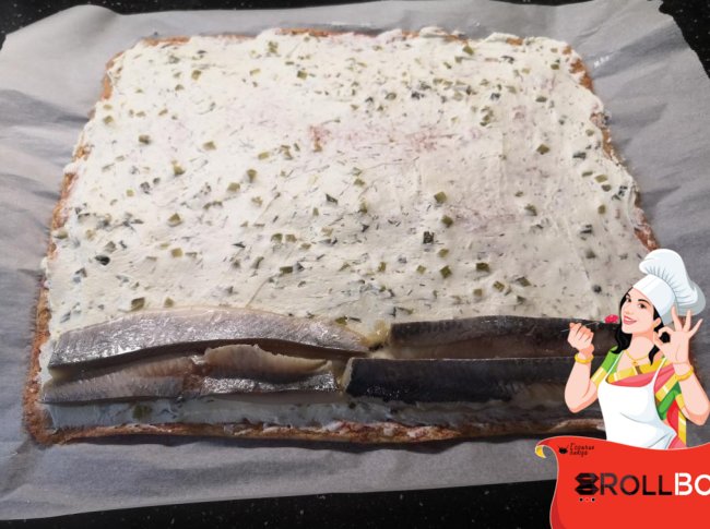Филе соленой селедки разрезаем вдоль пополам. На бисквит. смазанный творожным сыром с огурчиком, кладем филе с одной стороны.