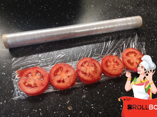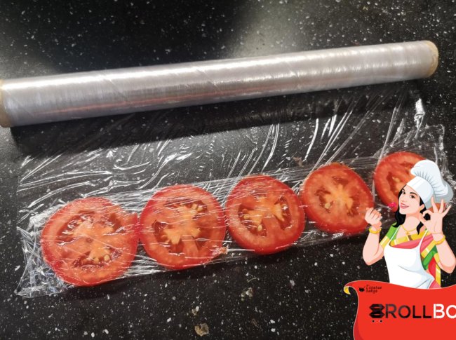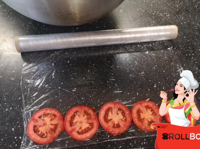 Замороженные кружочки томатов Приготовление Заморозила немного сливок... Лучше брать их, они обычно одного размера, не разваливаются... Попробовала сделать вот так... нарезала на терке Бернера помидорки... И на край пленки выкладывала по 5 кружочков, заворачивала как рулетик, потом опять слой