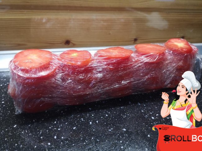 Попробовала сделать вот так... нарезала на терке Бернера помидорки... И на край пленки выкладывала по 5 кружочков, заворачивала как рулетик, потом опять слой томатов... и т.д. Выше 10 слоев лучше не делать. И сразу же убирайте в морозилку, чтобы не дали сок...
