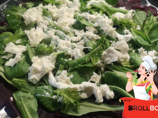 Здесь очень подойдет страчателла... но у меня была лишь буратта. Так что ее раскрошила и уложила сверху салата.