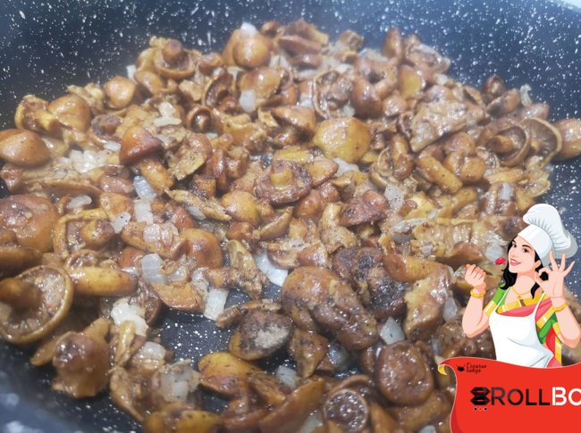Добавляем отварные грибы... Жарим еще минуты три. Солим, хорошо перчим.