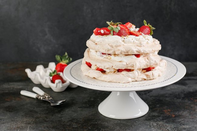 Рецепт: «Павлова» Ингредиенты 4 охлажденных белка 200 г сахара 1 ч. л. столового уксуса 9% 1 ч. л. кукурузного крахмала 200 мл сливок 33% 180 г творожного сыра 1 ст. л. сахарной пудры 150 г свежей клубники 30 г измельченных фисташек Приготовление Шаг 1 В чаше миксера на средней скорости взбить