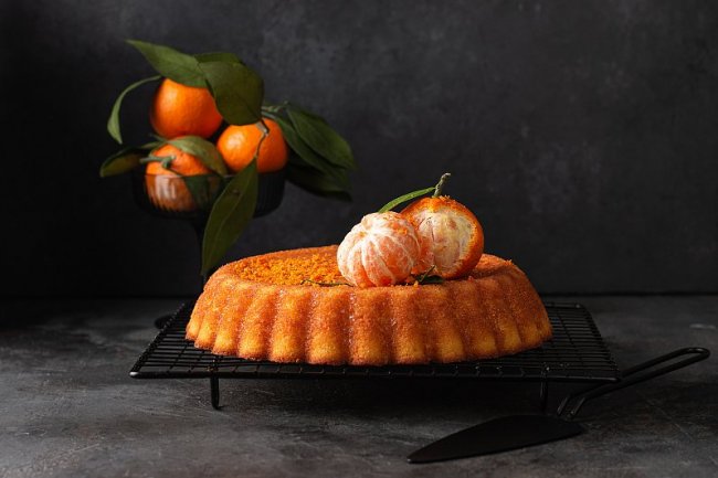 Готовый пирог оставить в форме на 5 минут, затем перевернуть на решетку для выпечки и дать остыть. Украсить натертой цедрой и мандаринами.